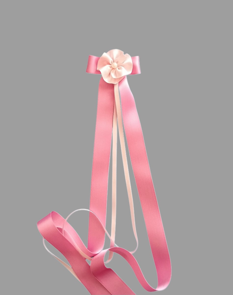 Nauhan pituus on n. 65cm ja leveys on 2,5cm (pinkki), kukka 0,6cm (vaalean pinkki)